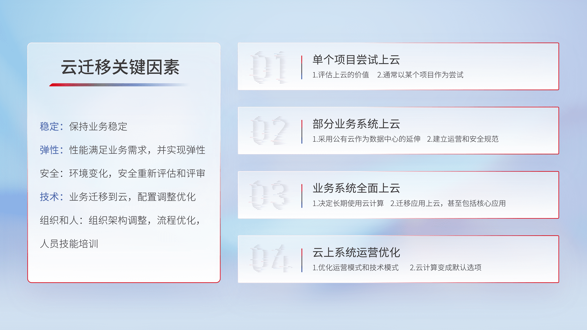 结合实际业务,,,从规划设计、、、、云平台选型、、云原生改造、、数据迁移、、、集成交付,,,迁移全过程为客户识别最佳上云路径,,,,做好风险识别管理,,,,设计网络架构、、身份权限、、、安全审计合规、、、操作审计、、、、日志审计、、监控告警策略、、、多站点容灾设计等,,对云上基础设施进行整体规划,,,提升IT治理水平,,,,以满足弹性、、、高可用、、、、高性能的需求。。。。