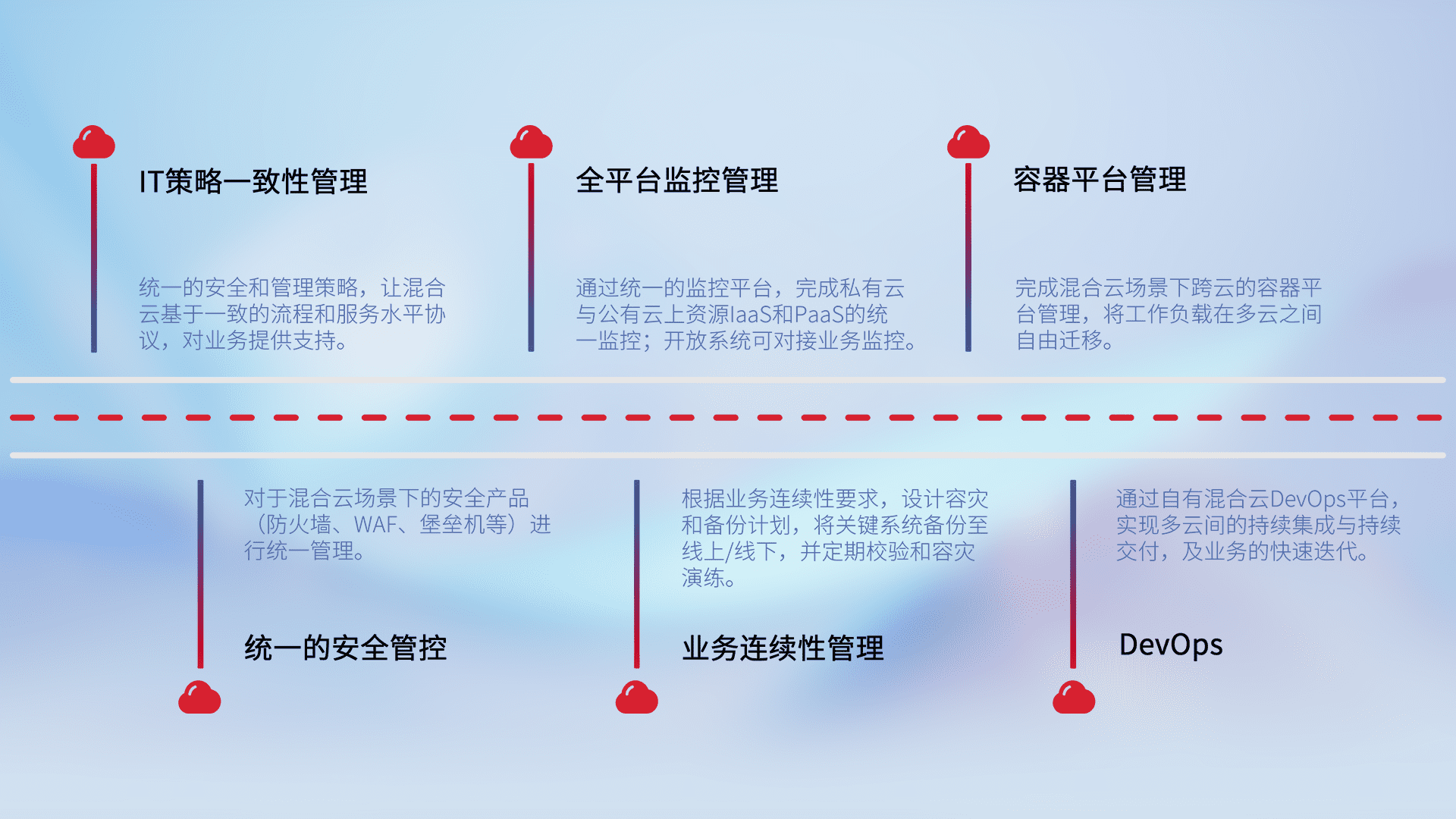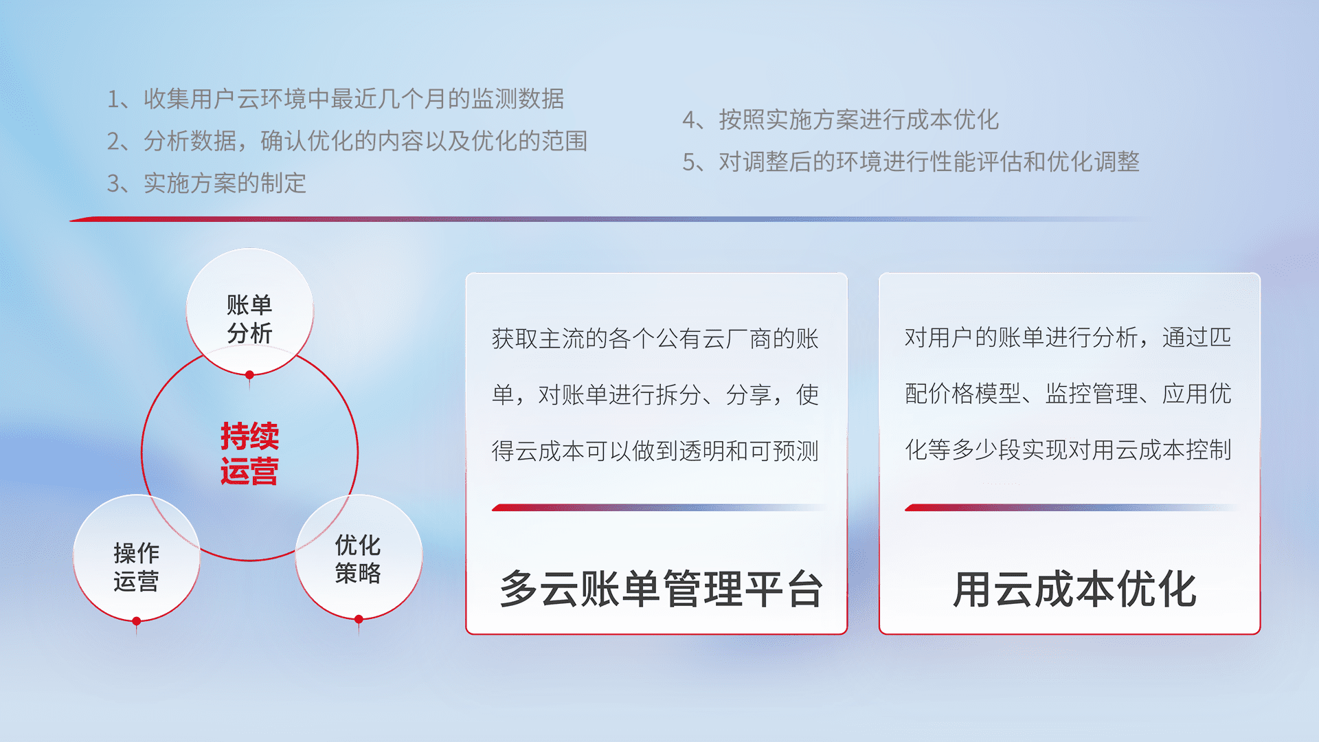 通过多云纳管,,以统一的资源数据模型把客户的云资源进行抽象和封装,,进而实现对多云资源的统一操作,,,,保障云资源管理的可靠性、、、、稳定性与可用性。。。量身定制化运维内容,,配置、、、、开发运维、、、补丁管理、、备份、、监控、、、认证和访问管理、、审计和日常巡检等,,,保障在用云过程中的可靠度,,,,稳定度以及高可用率。。。。
