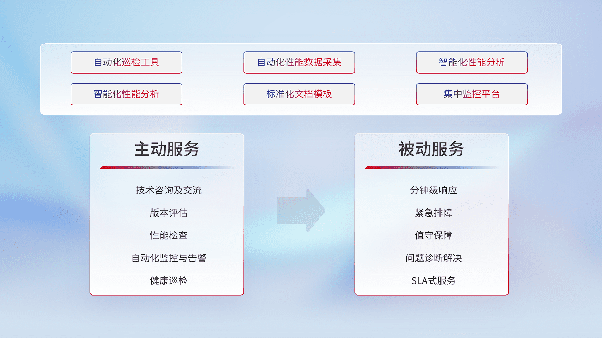智能化工具和标准化文档,,,,保障服务质量,,,,提供主动服务(包含技术咨询、、、、版本评估、、、、性能检查、、自动化监控与告警、、健康巡检)和被动服务包含(分钟级响应、、、紧急排障、、、、值守保障、、、问题诊断解决、、、、SLA服务)。。。